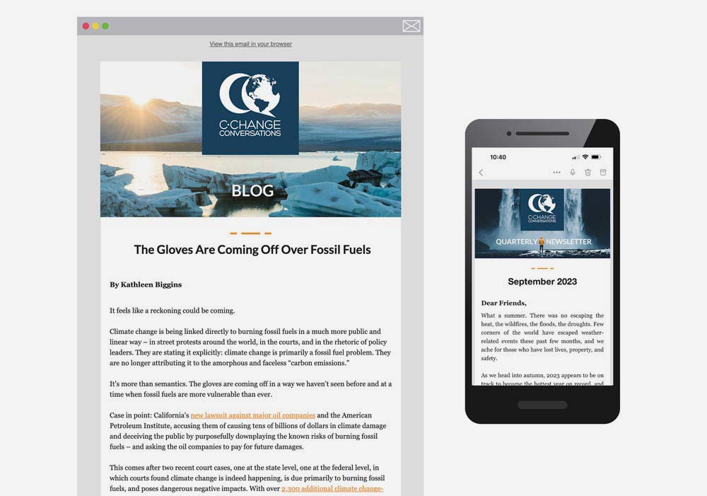 This project for C-Change Conversations centered on the redesign and development of a new website optimized for UX, accessibility and responsive performance. Digital assets such as social media templates and newsletter layouts were created to align with the aesthetic of the new site so messaging stayed consistent across platforms. The new design improved navigation so visitors could find resources, blogs and programs more easily. The result was a clear, engaging and professional online presence that strengthened outreach and encouraged climate conversations everywhere.